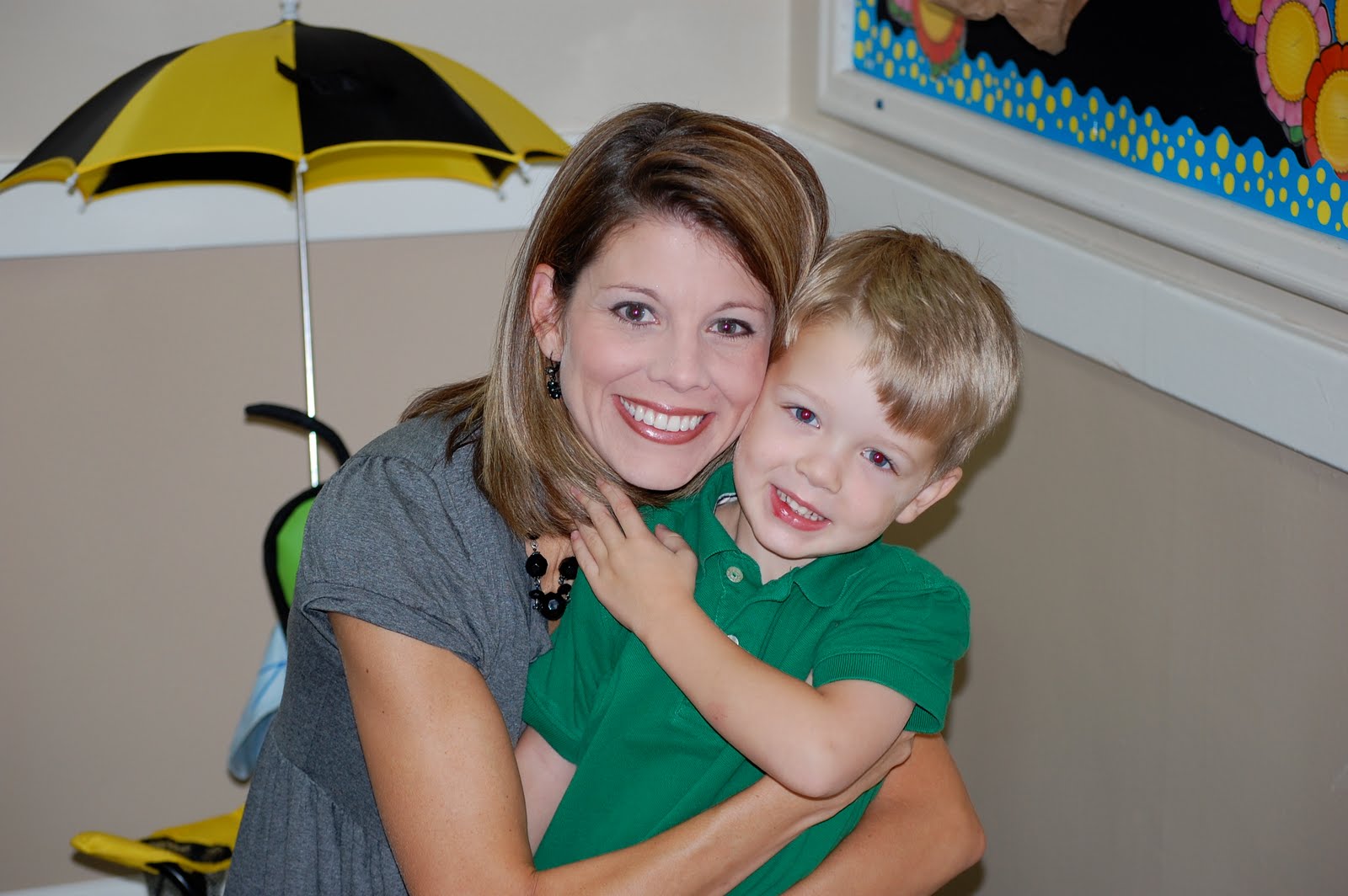 The long awaited first day of Pre-school was today and I had two VERY excited kids. Kate woke up 2 times last night (something she has never done) to ask if the sunshine was out yet so she could go to school. The first time she woke up she didn't call for me or Brian- she called for Brett- how cute is that! We had orientation last week and got to meet their teachers. They were so excited to see their rooms. They have been counting down the days since then to today. Brett wanted to take Kate to her room first. He took her all around her room to show her where her name was and show her all the pictures of her on the wall and her cubby. Kate started getting worried and asking if we were going to stay with her. I told her again about how she was going to stay with her friends and her teachers and I would be back after lunch. I also assured her that Brett was going to be right down the hall. Brett came over and started rubbing her back and patting her and giving her hugs. I almost lost it right there. Sweet big brother. We snuck out while she was with her teacher and took Brett to his room. He walked right in, hung up his bag, and started playing like he had been there for years. He gave us a hug, told us good-bye, and didn't even watch us leave. I was shocked- but very glad. The first day of pre-school and the only one who cried was me! Now I know how all those moms felt when they dropped their kids off to my Kindergarten class. I didn't think I was going to be so sad- but I was. Nothing a sweet tea from Chick-fil-A and some shopping couldn't fix though.